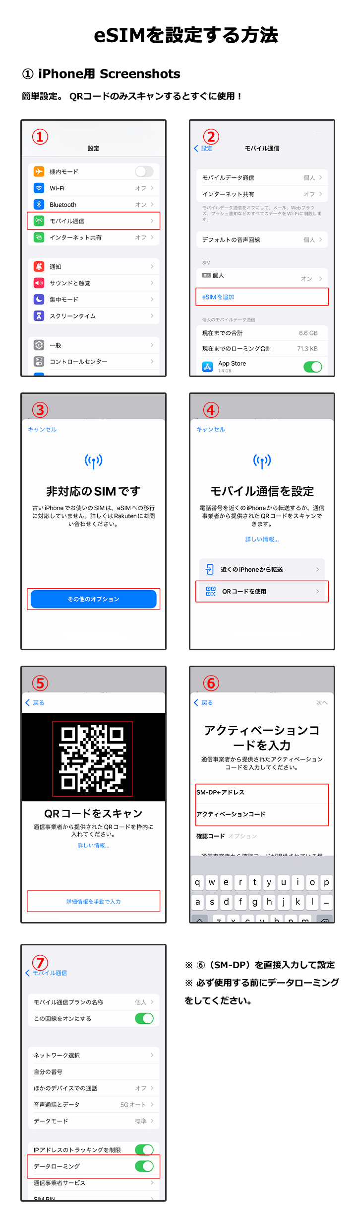 iOS : 設定 → モバイル通信 → eSIMを追加 → QRコードを使用 → QRコードをスキャン → データローミング「オン」