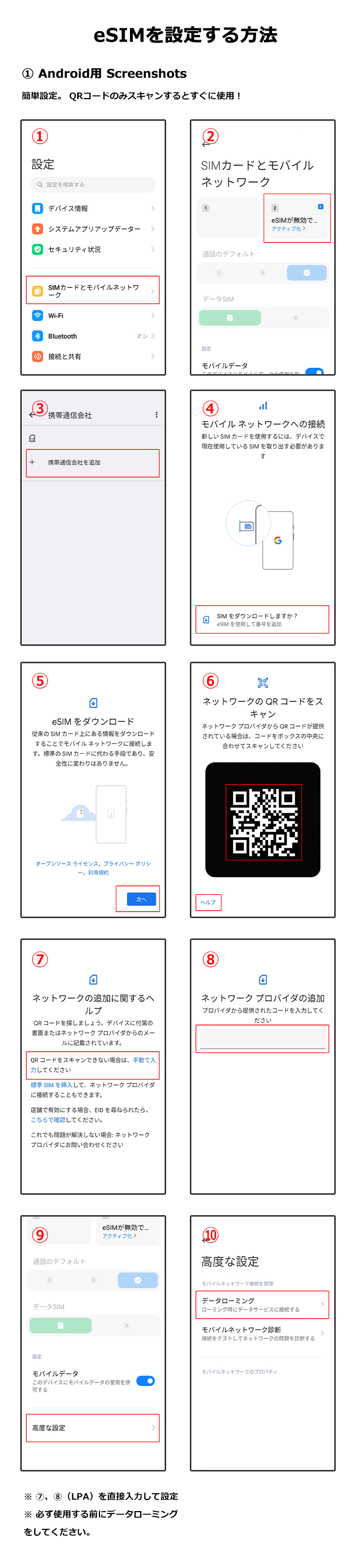 Android : 設定 → ネットワークとインターネット → SIM → eSIMを追加 → QRコードをスキャン → データローミング「オン」